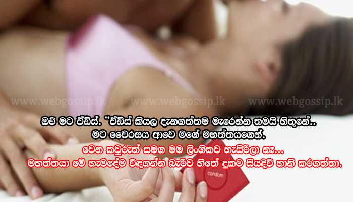 “ඔව්. මට වෛරසය ආවෙ මගේ මහත්තයගෙන්. වෙන කවුරුත් සමග මම ලිංගිකව හැසිරිලා නෑ. ඒ නිසා මම දන්නව මට එච්.අයි.වී. ආසාදනය වුණේ මගේ මත්තයගෙන් කියල. ඒත් මහත්තයට වෛරසය ඇතුල් වෙන්න ඇත්තෙ කොහොමද කියල මම දන්නෙ නෑ. එයා නිතරම විදේශ රටවල යන එන කෙනෙක්. එයා කරපු කියපු දේ අනුව මොනව වුණාද කියල මම දන්නෙ නෑ.”