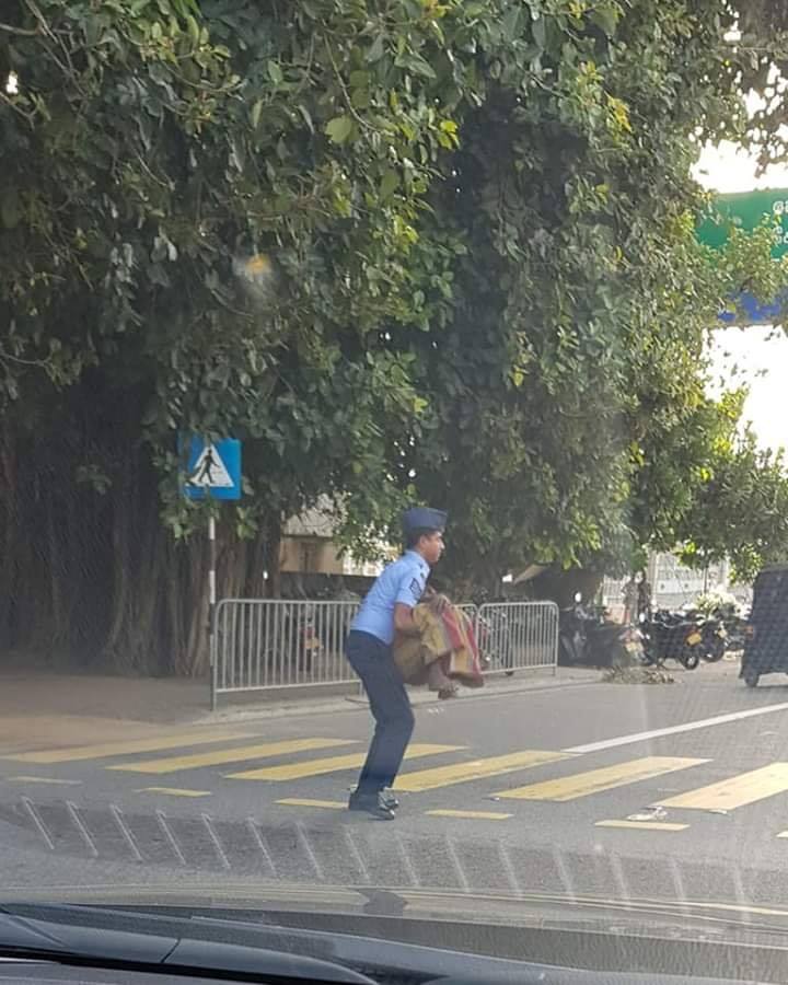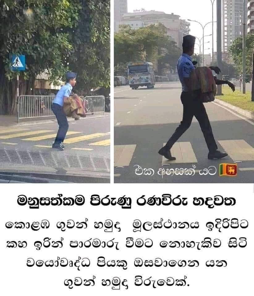 කොළඹ ගුවන් හමුදා මූලස්ථානය ඉදිරිපිට තිබෙන කහ ඉර මතින් ගමන් කිරීමට නොහැකි වයෝවෘද පියෙක් ඔසවාගෙන ගොස් පාර මාරු කරවන ගුවන් හමුදා සෙබලෙකුගේ ඡායාරූපයක් මේ දවස්වල අන්තර්ජාලය පුරාම හුවමාරු වෙමින් තිබෙනවා.