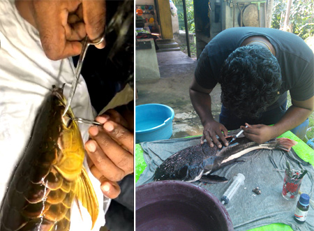 “මම මාසෙකට මාළුවන්ගේ සැත්කම් 10ක් 15ක් විතර කරනවා. මාතර, අම්පාර, අනුරාධපුර, හලාවත වගේ බොහෝ දුර පළාත්වලින් මට කතා කරනවා. මම ජංගම සේවාවක් සපයන්නේ. සැත්කම්වලට අවශ්ය උපකරණ, ඖෂධ වර්ග සියල්ලම බෑග් එකේ දාගෙන මම බස් එකේ යනවා. ඉස්සන් කොටුවල රෝග පැතිරුණාම මට එන්න කියලා උපදෙස් ගන්නවා. එක පාරක් විසිතුරු මසුන් ව්යාපාරයක් කරන කෙනකුගේ ලක්ෂ ගණන් වටිනා මාළුන්ට රෝගයක් වැලඳිලා. මාළු මැරි මැරී ගිහින්. මාළු සම්බන්ධ විශේෂ දැනුමක් තියෙන පිරිසකගෙන් ඒ ගැන අහපුවාම උපදෙස් දීලා තිබෙන්නේ ක්ලෝරින් දාලා මරන්න කියලා. ඒ පාර ඒ අය මාව හොයාගෙන ආවා. මම ගිහින් බලලා මාළුන්ට බෙහෙත් දැම්මා. මගේ බෙහෙතින් මාළු ටික සනීප වුණා. මැරුවා නම් අපරාදේ. ලක්ෂ ගණන් වටිනා මාළු.”