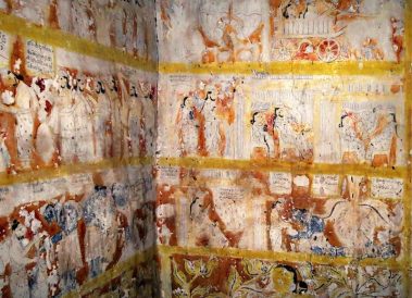 ඔත් පිළිමය පාමුල බිත්තියේ බුද්ධ පරිනිර්වාණය සහ ආදාහන උත්සවය සිතුවමට නගා තිබෙන අතර, ඒවාද මැකී යමින් පවතිනවා.
