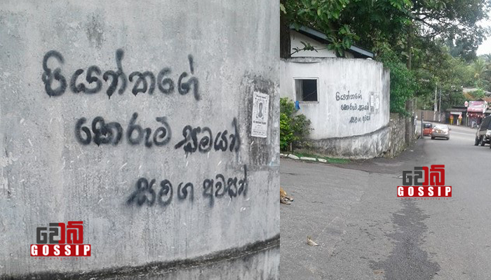 මේ සමගම අද උදෑසන කඩුවෙල මහනගරසභාවේ ඉදිරිපස තාප්පයේ කිසියම් පිරිසක් මෙවැනි වැකියක් ලියා තිබෙනවා.