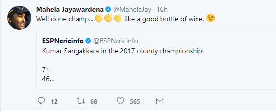 “සංගා හරියට පරණ වයින් බෝතලයක් වගේ” කියලා තමයි මහේල එයාගේ Twitter Account එක Update කරලා තිබුනේ.