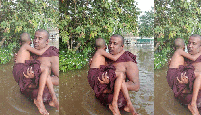 ලොකු හාමුදුරුවන්ගේ කරේ එල්ලී ගංවතුරෙන් එගොඩ වෙන පොඩි හාමුදුරුවෝ
