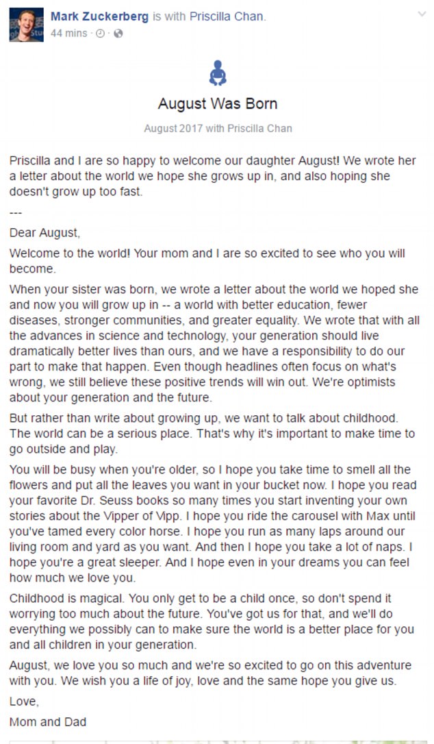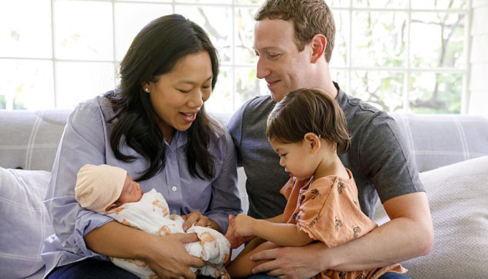 තම දෙවැනි දරුවා සමඟ මාර්ක් සකර්බර්ග් සහ සිය බිරිඳ සිටින ඡායාරූපයක් එක්කරමින් එම සටහන දමා තිබුණා.