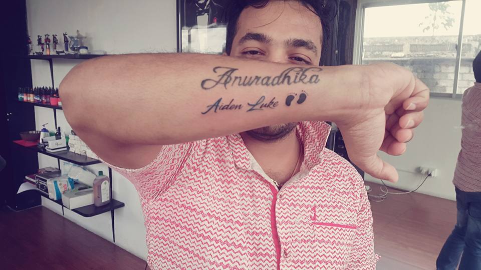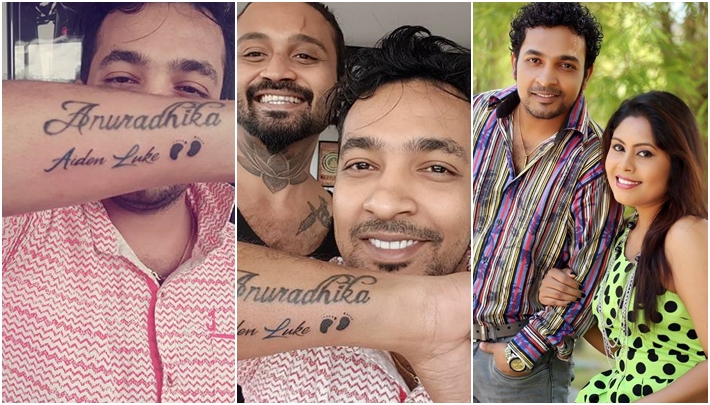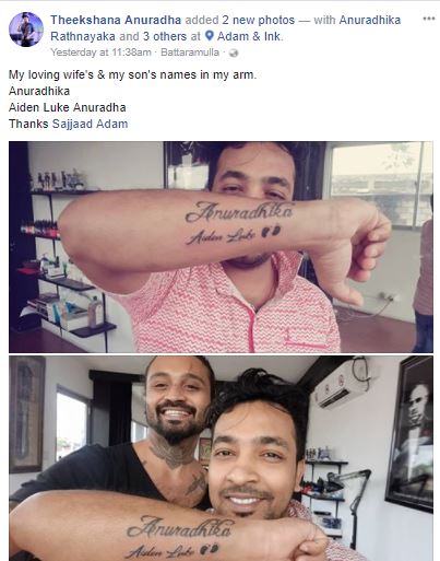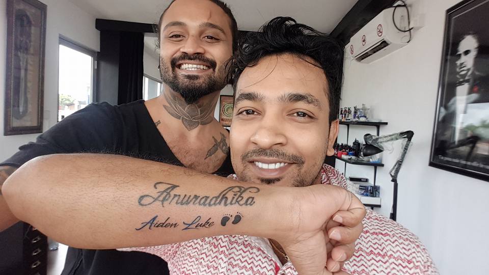 ඒ තමයි බිරිඳ අනුරාධිකාගේ හා පුතු Aiden luke Anuradha ගේ නම් සහිත ටැටූ එකක් අතේ සඳහන් කර ගැනීම.