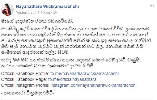 ඒ අතරතුර ඇයගේ නම සහ ඡායාරූප යොදාගෙන කරන වැඩක් ගැන නයනතාරා සිය මුහුණුපොතේ සටහනක් තබා තිබෙනවා.