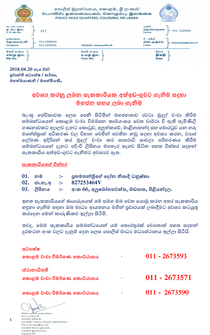 සාවද්‍ය ලේඛන සකසා මුදල් වංචා කළ මෙම කන්තාව කොටුකර ගැනීම සඳහා පොලිසිය මහජනතාවගෙන්ද සහය පතනවා.