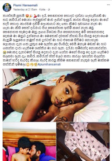 තාත්තයි පුතයි ???මා දරැ සෙනෙහස හොදට දන්නා ගැහැණියකි මා හට කව්රැන් මොනා පැවසුවත් මාව ලගින් ඇසුරැ කරන සියලු දෙනා මාගේ හැටි හොදා කාරවම දනිමි.ලොකයාට කැ ගසා කිමට අවශ්‍යය නැත මා ගැන.මා කිසි සෙත් දරැවාට පිය සෙනේහස අහිමි කරෙ නැත.මවු සෙනෙහස සැමදාම ඔහු ලගය.විටෙක පිය සෙනෙහසද මව් සෙනෙහසද දෙකම මා ඔහුට දුන්නෙය.මා මෙතෙක් දවසක් නිහඩ විය.සියලු දෙනාගෙම බැනුම් ඇසුවේය. නමුත් තව දුරටත් මා හට එහෙම සිටිමට නොහැක ලෝකයා දැන ගත යුතුය.මෙ ඇත්ත plz පිංසිද්ද වෙයි.ඔනැම මඩක් මා හට ගසන්න දාරා ගැනිමේ ශක්තිය මා හට ඇත. දරැවා සම්බන්ධ නොකරන්න.?මොකද දැනටමත් සියලු දෙනාට දැන ගන්න ඔනේ සියලු දේ දැන ගැනිමට සලසවා ඇත.දැං කව්රැ කව්රැත් හිත් වලට කතා කරලා අහන්න බලන්න තමන් හරිද වැරදිද කියලා.වැරදි කරපු කිසිම කෙනෙක් නැතුව ඇති ඔක්කම පත්තිනි අම්මලා???#piumihansamali