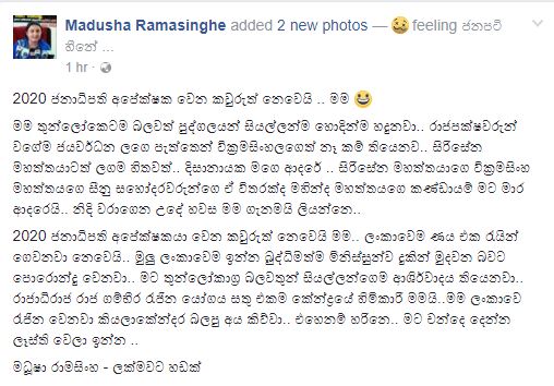 රංගන ශිල්පී ලක්මවට හඬක් සංවිධානයේ සභාපති මධූෂා රාමසිංහ සිය මුහුණුපොතේ සටහනක් තබා කියා තිබුණේ තමන්ට 2020 ජනාධිපති අපේක්ෂකයා වෙන්න යෝගයක් තියෙනවා කියලයි.
