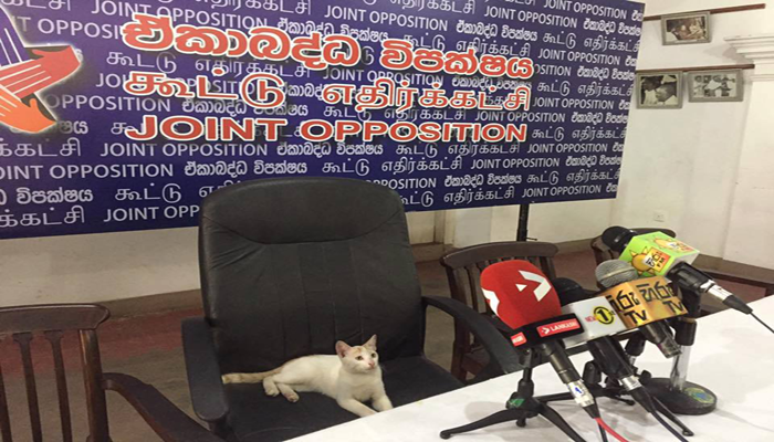 ඒකාබද්ධ විපක්ෂයේ මාධ්‍ය හමුවට සහභාගී වන දේශපාලඥයන් සඳහා සූදානම් කර තිබූ ආසනයක පූසෙක් සිටින ඡායාරූපයක් අන්තර්ජාලයේ හුවමාරු වෙමින් පවතිනවා.
