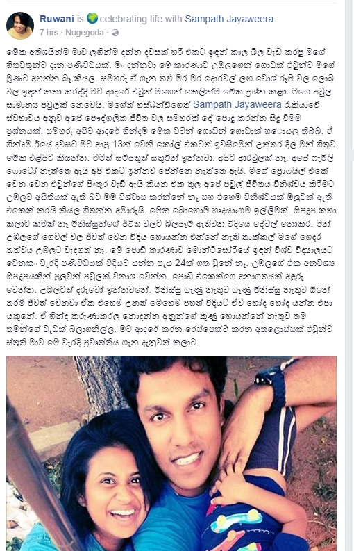මේ දේවල් ගැන සම්පත්ගේ බිරිඳ මුහුණුපොතේ මෙවන් සටහනක් තබා තිබුණා.