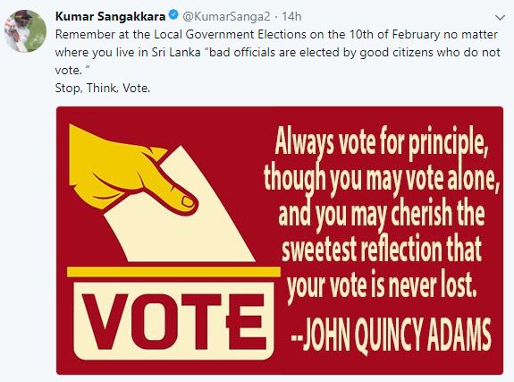 මේ උණුසුම තවත් වැඩිකරමින් සුපිරි ක්රිකට් ක්රීඩකයෙකු වන කුමාර් සංගක්කාර මැතිවරණය සම්බන්ධයෙන් සිය අදහස පලකර තිබෙනවා.