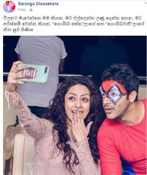 අපි මේ කියන්න යන්නේ සාරංග සිය මුහුණුපොතේ දැමූ අපූරු සටහනක් ගැනයි.