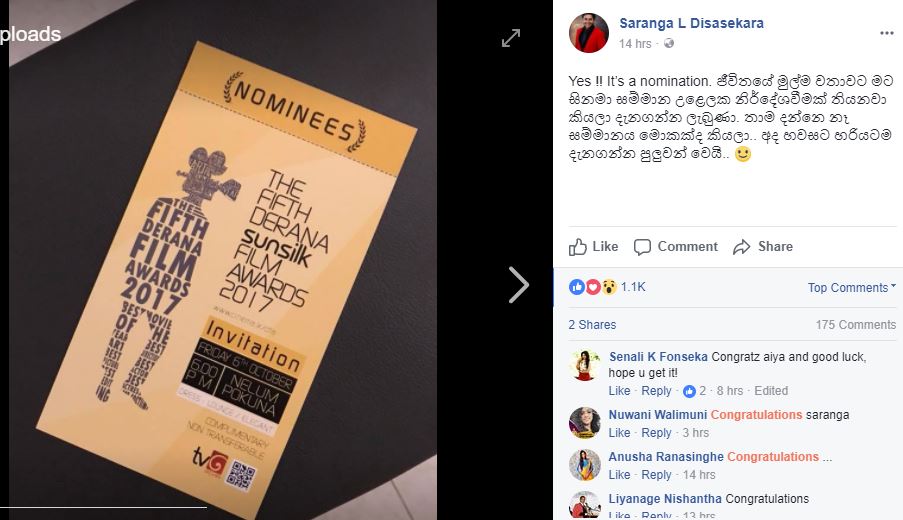 “Yes !! It’s a nomination. ජීවිතයේ මුල්ම වතාවට මට සිනමා සම්මාන උළෙලක නිර්දේශවීමක් තියනවා කියලා දැනගන්න ලැබුණා. තාම දන්නෙ නෑ සම්මානය මොකක්ද කියලා.. අද හවසට හරියටම දැනගන්න පුලුවන් වෙයි.”
