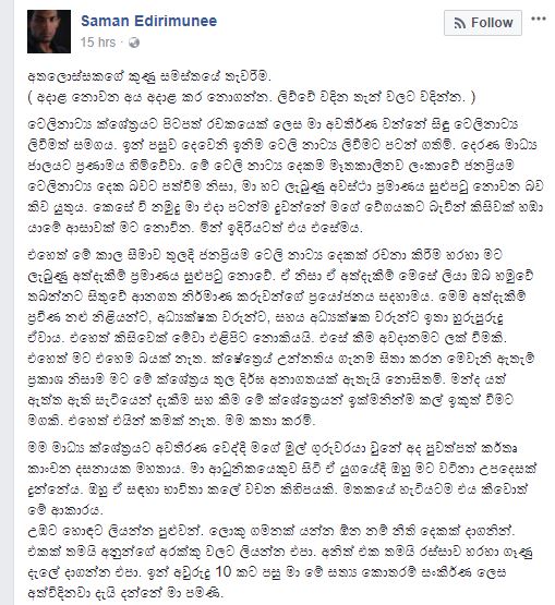 මේ හැමදේම අතරේ කාටත් බලන්න පුළුවන් ටීවී දෙරණ ඔස්සේ ඔබේ ආලින්දයට එන ලංකාවේ අංක එකේ ටෙලි සිත්තම් දෙකක් වන සිදූ සහ දෙවැනි ඉනිම ලියූ සමන් එදිරිමුණි අපූරු සටහනක් සිය මුහුණුපොතේ තබා තිබුණේ මෙලෙසින්.
