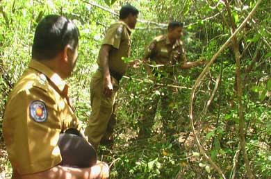 ඒ අනුව ඊයේ (23) දිනයේ රහස් පොලිසියත් බුද්ධි අංශයත් බස්නාහිර උතුරු අපරාධ විමර්ශන ඒකකයේ නිලධාරීනුත් ගම්වාසීනුත් එක්ව කැලෑව පරීක්ෂා කරලා තියෙනවා. ඒ වෙලාවේ සැකකරු සරත් අයියාගේ වත්ත නමැති ප‍්‍රදේශයට පැන දුවන බව එක් අයෙකු දැක තිබෙනවා.  ඒ අලූයම 5.30ට පමණ. ඒ අනුව සියලූ දෙනාම ඔහු පසුපස පන්නා තියෙනවා. එසේ ලූහුබැඳීමේ දී සැකකරු සැඟව සිටි ස්ථානය ද හමුවෙලා. එතැන කුඩා වළක්. ඒ තුළ පුවක් අතු දමා නිදාගන්න පුළුවන් විදියට හදාගෙන තිබිලා. එතැන තිබිලා හිස් බිස්කට් පැකට් කිහිපයක් අනෝදා ගෙඩියක් ද පොලිසියට හමුවෙලා තියෙනවා. පසුව තවත් ඉදිරියට යාමේ දී ඔහු සිටි තවත් තැනක් හමුවී ඇති අතර ඔහු රාත‍්‍රියේ පොරවනු ලැබූ රෙද්දක් සහ දුරකථනයක් ද හමුවෙලා තියෙනවා.