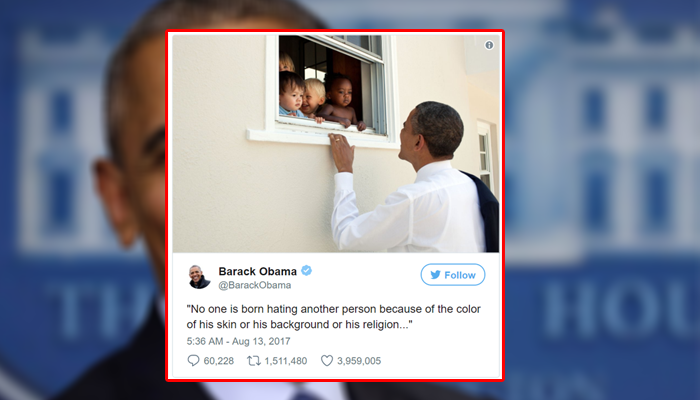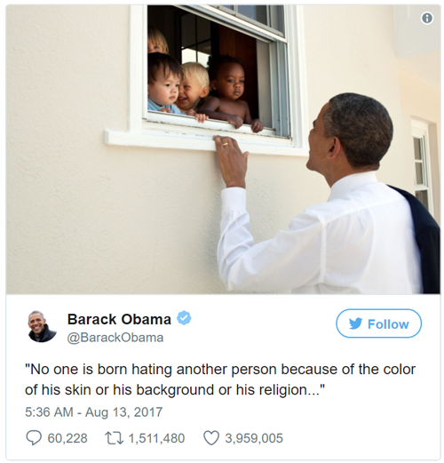 නෙල්සන් මැන්ඩෙලාගේ ප්රකාශයක් උපුටා දක්වමින් වෙනස් වාර්ගික පසුබිම් සහිත දරුවන් කණ්ඩායමක් සමග සිනාසෙන ආකාරය දැක්වෙන ඡායාරූපයකුයි ඔබාමා ට්විටර් පණිවුඩයෙන් දක්වා තිබුණේ.