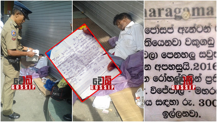 “මහරගම ආසිරි” යනුවෙන් සඳහන් වුණු කොලයක්ද ඔහු ළඟතිබී හමුවී ඇති අතර එහි ” මගේ නම ජෝසප් ඇන්ටන්. මට පිළිකා රෝගයක් තියෙනවා. වකුගඩු ඔක්කොම සවුත්තු වෙලා. කතා කරන්න අපහසුයි. 2016 මහරගම සහ කරාපිටිය රෝහල්වලින් ප්‍රතිකාර ගත්තා. වෛද්‍ය විජේපාල – මහරගම ශල්‍යකර්මය සඳහා රුපියල් 3000,000 ඉල්ලනවා” යනුවෙන් සඳහන් වනවා.