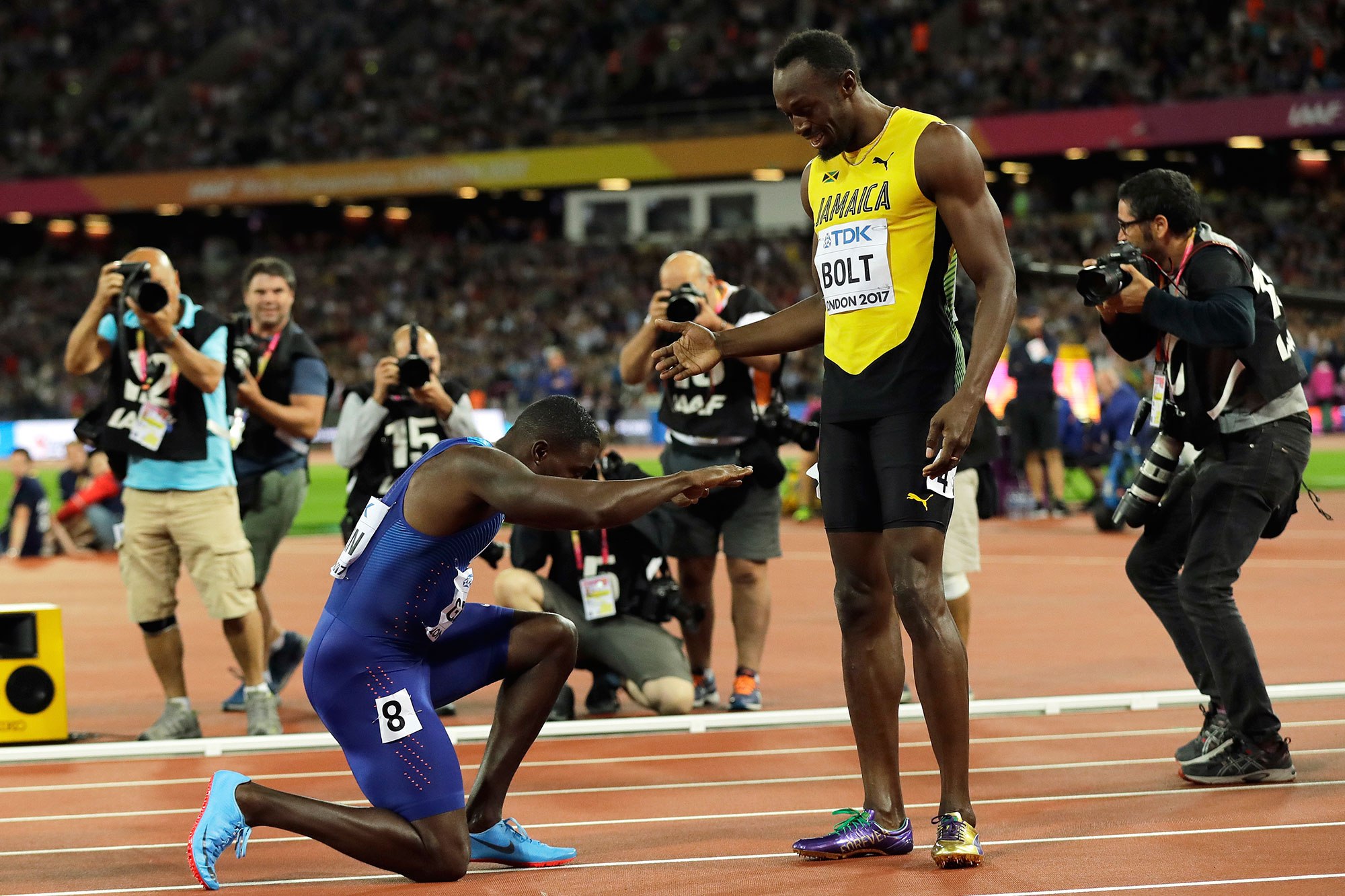 මෙම තරගයේ රන් පදක්කම දිනාගත් ගැට්ලින් සිය තරගය නිමා කළ පසු ලොව සුපිරි ධාවකයා වුණු උසේන් බෝල්ට දණ නමා ආචාර කළේ ප්රේක්ෂකයන්ගේ සිත් හැඟුම්බර කරමින්.