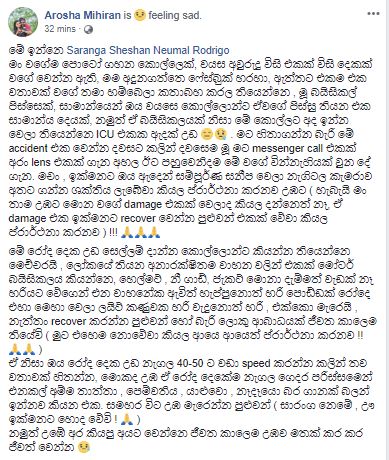 මේ ගැන ඔහුගේ හිතවතියක් සංවේදී සටහනක් මුහුණුපොතට දමා තිබුණා.