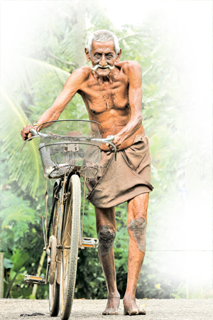 “මම උපන්නේ 1933 අවුරුද්දෙ… ඉපදුණු දවසේ ඉඳන් ඉන්නේ සියඹලාගොඩ, පොල්ගස්ඕවිට ගමේ. එදා ඉඳන් අද වෙනකම් මම ඇඳුමකට කියලා අඳින්නේ අමුඩ ලේන්සුව. ඒක මගේ පුරුද්දක්… මගේ වයසේ අනිත් හැමෝම අමුඩ ලේන්සුවෙන් සරමට, කලිසමට මාරු වුණා. ඒත් මට ඒ පුරුද්ද අතෑරගන්න බැරි වුණා. අමුඩ ලේන්සුව ඇඳගත්තම තියෙන පහසුව, හිතට එන ගැම්ම, ආත්ම අභිමානය වෙන කිසිම ඇඳුමකින් මට ලැබෙන්නේ නැහැ.