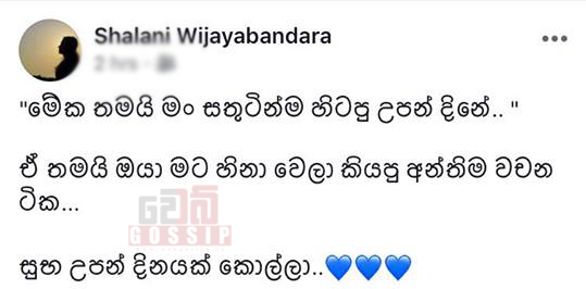 ඒ අතරින් දසුන්ගේ මරණය සම්බන්ධයෙන් බොහෝ ලෙස කතාබහට ලක්වූ ශලිනි තාරකා සිය ෆේස්බුක් ගිණුමට සටහනක් යොදා තිබුණා.