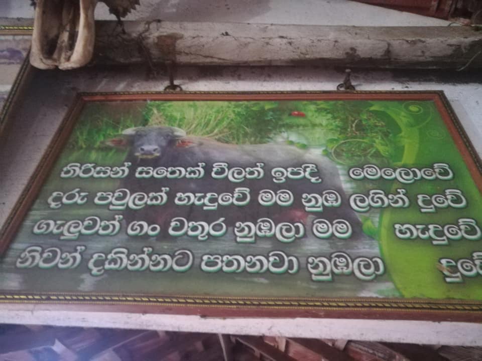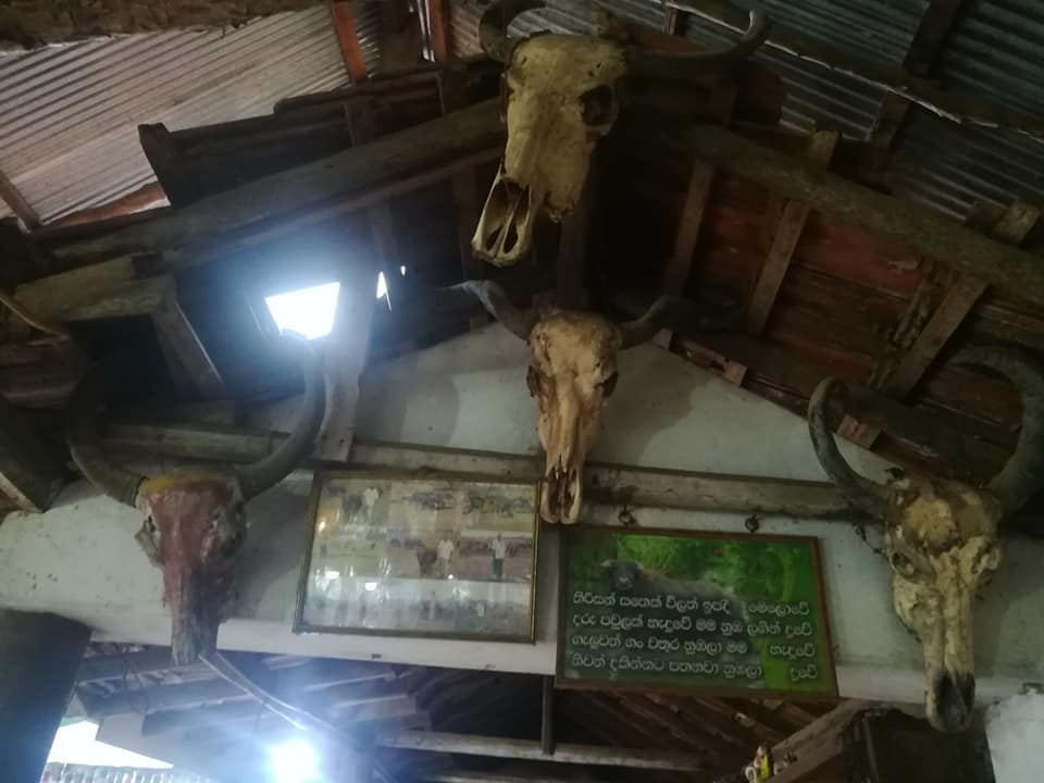 ගවයින් සිව්දෙනෙකුගේ හිස් කබල සතරක් හා රාමු කරන ලද පින්තූර දෙකක් නෙත ගැටුනි.