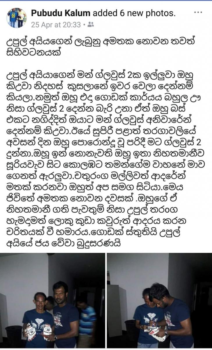 උපුල් අයියාගෙන් මන් ග්ලවුස් 2 ඉල්ලුවා. ඔහු කිව්වා නිදහස් කුසලානේ ඉවර වෙලා දෙන්නම් කියලා. නමුත් ඔහූ එදා ගොඩක් කාර්යය බහුල ඌ නිසා ග්ලවුස් දෙක දෙන්න බැරි උනා. ඒත් ඔහු බස් එකට නගිද්දිත් ඔයාට මන් ග්ලවුස් අනිවාරේන් දෙන්නම් කිව්වා. ඊයේ සුපිරී පළාත් තරගාවලියේ අවසන් දින ඔහු පොරොන්දූ වූ පරිදී මට ග්ලවුස් දෙක දුන්නා. ඔහූ ඉන් නොනැවති ඔහූ ඉතා නිහතමානීව සූරියවැව සිට කොලඹට තමන්ගේම වාහනේ මාව ගෙනත් ඇරලුවා. චතුරංග මල්ලිවත් ආදරේන් මතක් කරනවා ඔහුත් අප සමග සිටියා. මෙය ජිවිතේ අමතක නොවන දවසක් . ඔහුගේ ඒ නිහතමානී ගති පැවතුම් නිසා උපුල් තරංග හැමදාමත් ලොකු කුඩා කවුරුත් ආදරය කරන චරිතයක් වී හමාරය. ගොඩක් ස්තුතියි උපුල් අයියේ ජය වේවා බුදුසරණයි ” යනුවෙනි.