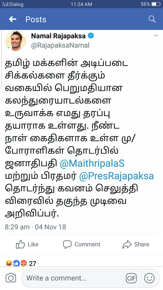 මේ හැමදේම අතරේ නාමල් රාජපක්ෂ මහන්ත්රීවරයා ට්විටර් සටහනක් තබා තිබුණා.