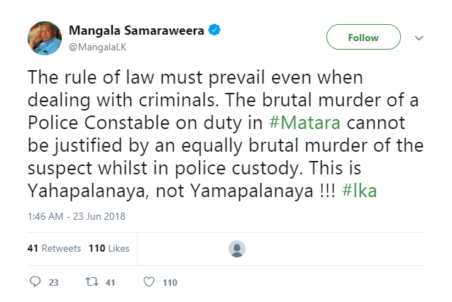අදාළ සිද්ධිය සම්බන්ධයෙන් සිය ට්විටර් ගිණුමේ සටහනක් තබමින් මංගල සමරවීර අමාත්යවරයා සඳහන් කර ඇත්තේ රාජකාරියේ නිරත පොලිස් කොස්තාපල්වරයෙකු කොල්ලකරුවෙකුගේ වෙඩි පහරින් මියයාම අදාළ සිද්ධිය සම්බන්ධයෙන් අත්අඩංගුවට ගත් සැකකරුවෙකු ඝාතනය කිරීම තුළින් සාධාරණීකරණය කළ නොහැකි බවයි.