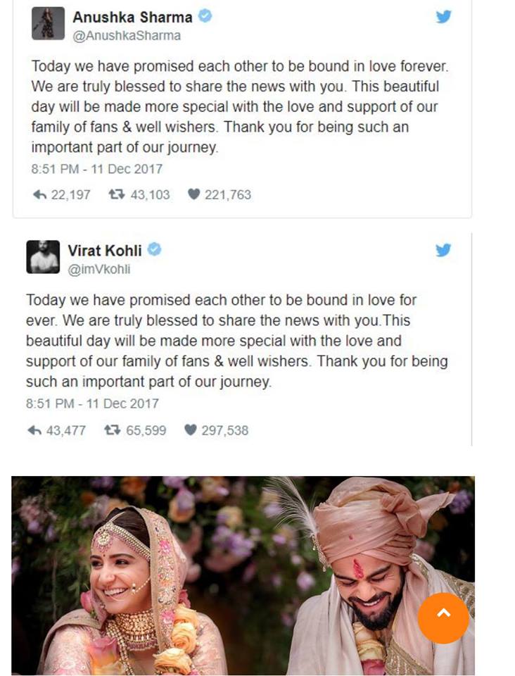 අනුෂ්කා ශර්මා දැමූ ට්විටර් සටහනක් ඒ ආකාරයෙන්ම කෝලිගේ ට්විටර් ගිණුමේද සටහන් වී තිබීමත් නිසා සමාජජාල මාධ්‍යයන් වල එය බොහෝ සෙයින් හුවමාරු වී තිබෙනවා.