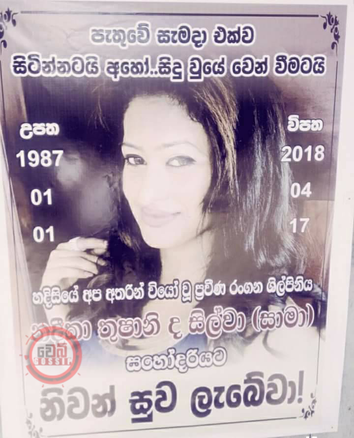 පසුගියදා ගිනිගත්හේන, යටිබේරිය ප්රදේශයේදී කැලණි ගඟේ දිය නෑමට ගිය රංගන ශිල්පිනී තුෂානි ද සිල්වා දියේ ගිලීමෙන් ජීවිතක්ෂයට පත්වුණා.