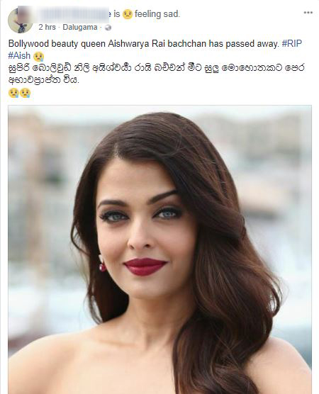 තවත් අය අයිෂ්චර්යා රායි අවසන් ගමන් ගිහින් කියලා පෝස්ට් දාලා තිබුණා.