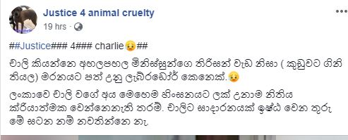 පසුගිය දෙසැම්බර් 31 වැනිදා රාත්රියේදී භූමිතෙල් දමා “චාලි” නමැති ලැබ්රඩෝ වර්ගයේ මෙම සුනඛයා මරා දමා ඇති බවයි වාර්තා වන්නේ.