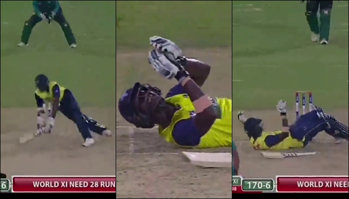 ලකුණු 198ක ජයග්‍රාහී ඉලක්කයක් හඹායාමට පිටියට පිවිසි ලෝක කණ්ඩායමට පන්දුවාර 20 අවසානයේ ලබාගත හැකිවූයේ ලකුණු 177ක් පමණක් වන අතර හසන් අලී විසින් ඩැරන් සමී වෙත යොමුකළ යෝකර් පන්දුවට බිම ඇදවැටුණු ඔහු අත්පුඩි ගසමින් විශිෂ්ට පන්දුයැවීම අගය කළේ මෙලෙසින්…..