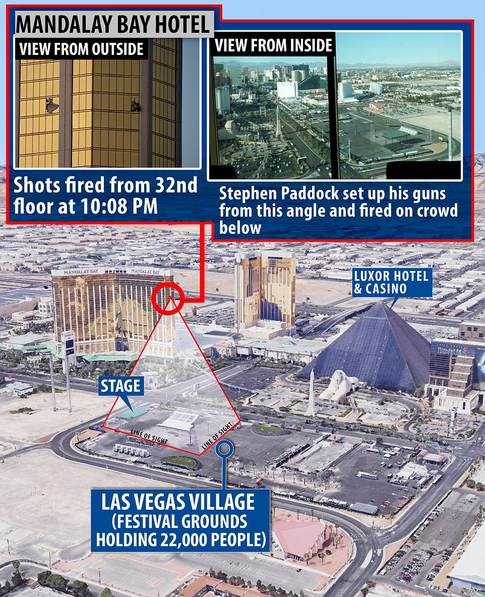 ලාස්වේගාස් හි “මැන්ඩෙලා බේ” හෝටලයේ 32 වන මහලේ සිට 64 හැවිරිදි ස්ටෙෆන් ෆැඩොක් නැමැති පුද්ගලයෙකු මෙම වෙඩි තැබීම සිදුකර ඇති බව එරට පොලීසිය පෙන්වා දුන්නේය. ඔහු විසින් වෙඩි ප්‍රහාර සිය ගණනක් එල්ල කර ඇති බව සිද්ධිය ඇසින් දුටුවන් ප්‍රකාශ කර තිබේ.