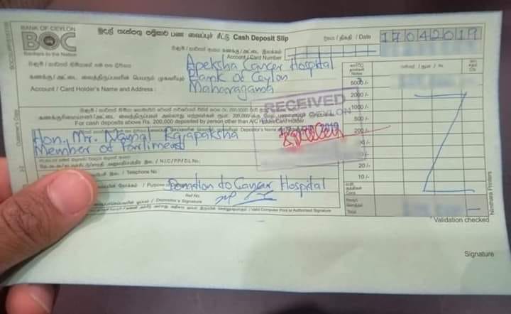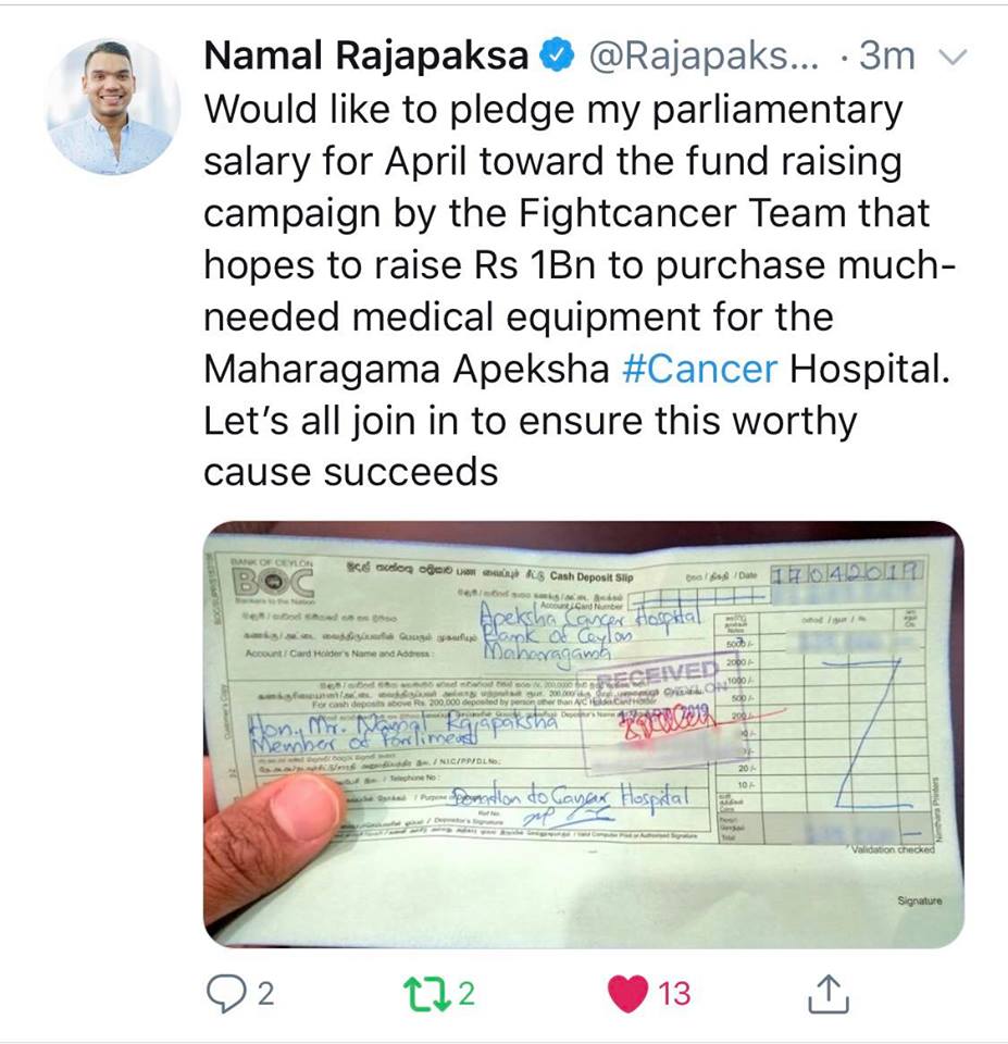 මහරගම අපේක්ෂා පිළිකා රෝහල සදහා අත්යාවශ්යය රුපියල් බිලියයනකට අධික වෛද්යය උපකරණ මිලදී ගැනීම සදහා “Fightcancer” කණ්ඩායම මගින් කරගෙන යනු ලබන සමාජ සත්කාරය සදහා නාමල් රාජපක්ෂ මහතා මෙලස අප්රේල් මස ඔහුගේ පාර්ලිමේන්තු මන්ත්රී වැටුප පරිත්යාග කර තිබුණා.