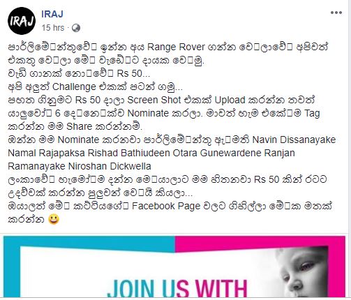 ඒ තමන්ද මහරගම අපේක්ෂා රෝහලේ ගිණුමට මුදල් බැර කර තවත් පිරිසක් මෙම අභියෝගයට නම් කිරීමයි..
