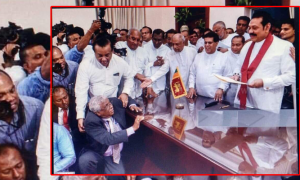 අගමැතිවරයා වැඩ බාරගත් අවස්ථාවේ අග්රාමාත්ය ලේකම් වරයා බිම වැටුණු බවට පවසමින් ඡායාරූපයක්ද සමගින් සාවද්ය පුවතක් පැතිර යමින් තිබෙනවා. මෙම අවස්ථාවේදී ඔහු සිටින්නේ...