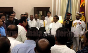 ජනාධිපති ලේකම් කාර්යාලයේ දී, ජනාධිපති මෛත්රීපාල සිරිසේන මහතා ඉදිරියේ මහින්ද රාජපක්ෂ මහතා දිවුරුම් දුන් බව සඳහන් වෙයි. මහින්ද අමරවීර, දුමින්ද දිසානායක, එස්.බී.දිසානායක...