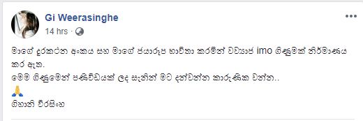 ගිහානි වීරසිංහගේ දුරකථන අංකයට ලද imo පින් අංකය සූක්ෂමව ලබාගත් අයෙකු , ඇයගේ ඡායාරූප හා දුරකථන අංකය යොදා ගනිමින් ගිහානිගේ දුරකථන අංකයේ ඇමතුම් ලැයිස්තුවේ සිටි දහසකට අධික පිරිසක් සමග ‘චැට්‘ කර ඇති බවයි වාර්තා වන්නේ.