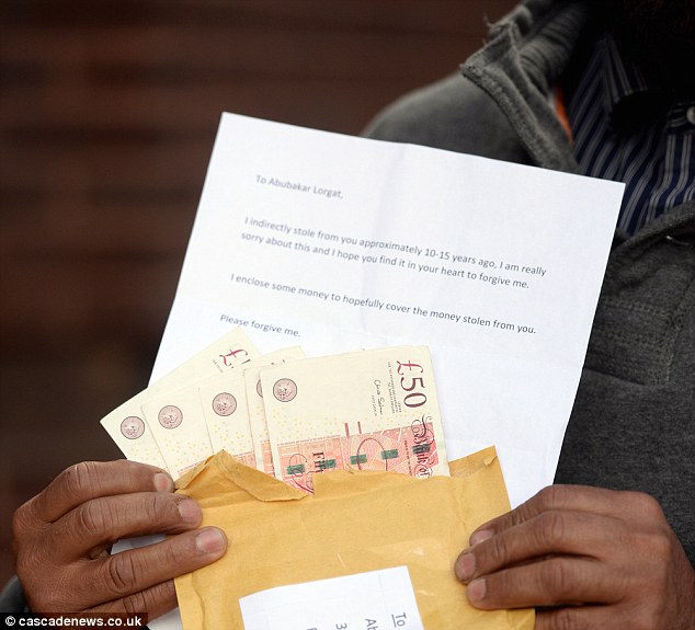 අවුරුදු 15කට පමණ ඉහතදී මා ඔබගේ මුදල් පසුම්බිය සොරකම් කළා. ඒ පිළිබඳව මා අතිශය කනගාටු වෙන අතර ඔබගෙන් සමාව අයද සිටිනවා. මා ඔබගෙන් සොරකම් කරනු ලැබූ මුදල් මෙම ලිපිය සමග එවීමට කටයුතු කර තිබෙනවා.