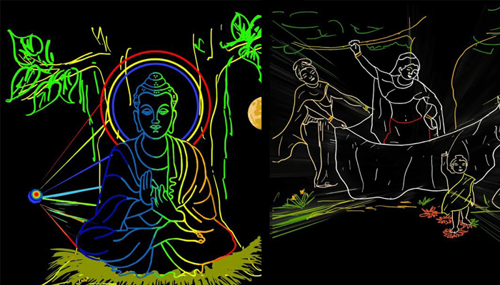 ලේසර් තාක්ෂණය උපයෝගී කරගනිමින් නිර්මාණය කෙරෙන එම තොරණේ නිර්මාතෘ ආචාර්ය ප්රභාත් චන්දිම උක්වත්ත මහතායි. පසුබිම් සංගීතය විමලජීව දොඹවත්ත මහතාද, කතා වස්තුව දිමුතු චින්තක මහතාද ඉදිරිපත් කරනවා. රාත්රී කාලයේ අහසේ සිතුවම් වන මෙම තොරණ දෙස් විදෙස් බැතිමතුන්ගේ සුවිශේෂී අවධානයට යොමු වනු ඇතැයි ආචාර්ය ආචාර්ය ප්රභාත් චන්දිම උක්වත්ත මහතා සඳහන් කරනවා.